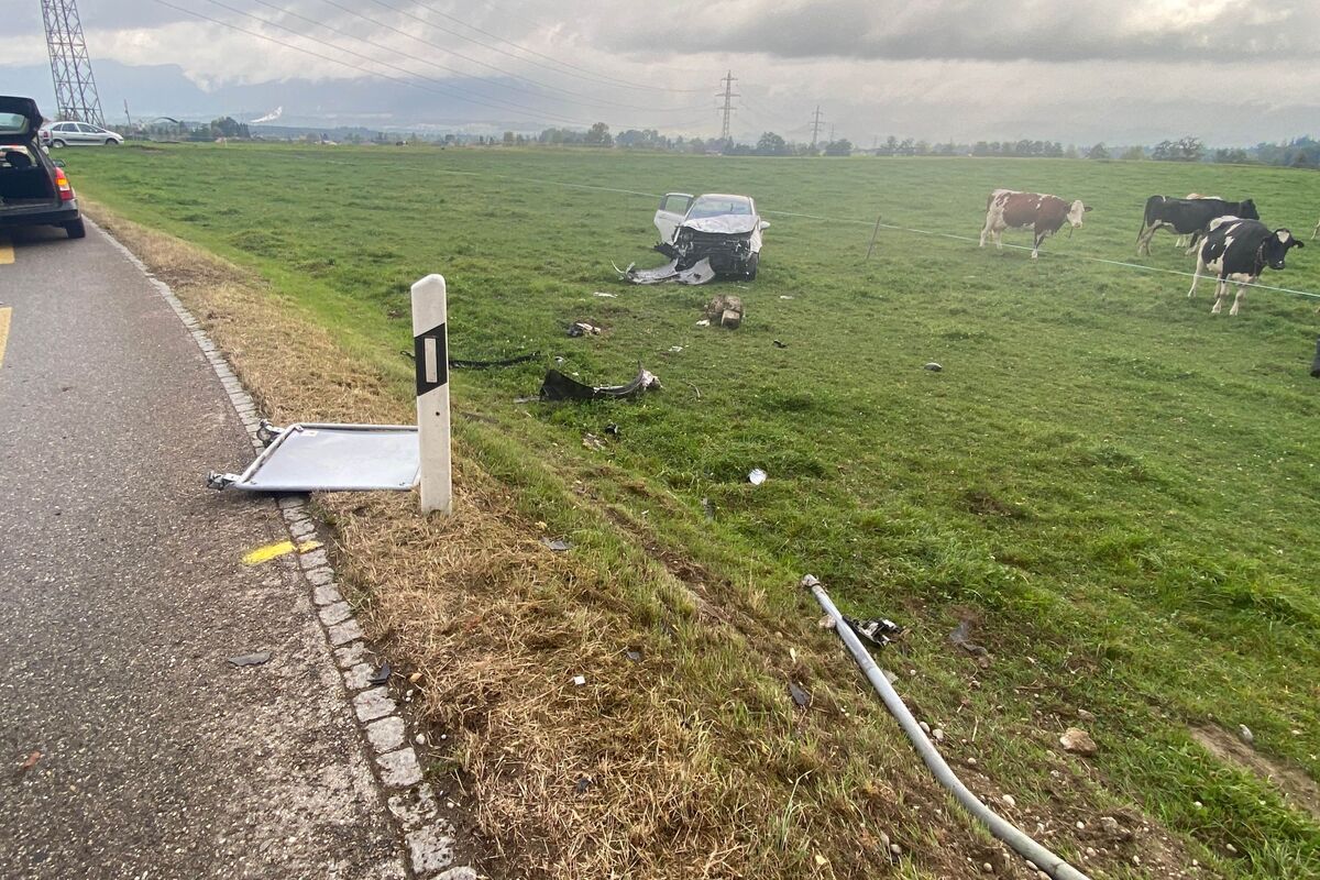 Das Auto kollidierte mit einem Verkehrsschild und kam in der Folge von der Strasse ab wo es sich überschlug und schliesslich im angrenzenden Wiesland zum Stillstand kam. Die Lenkerin wurde dabei leicht verletzt. Es entstand Sachschaden und das Auto wurde abgeschleppt.