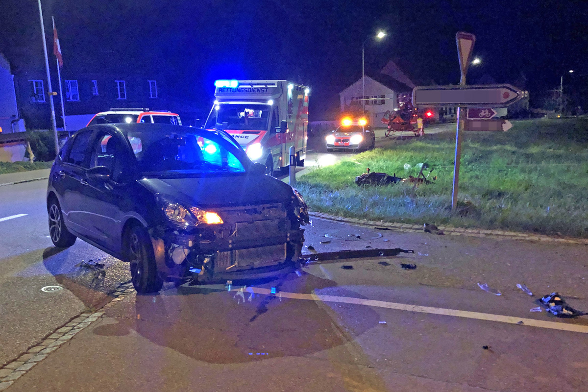 Bei der Kollision mit einem Auto wurde am Montag in Tägerwilen ein Motorradfahrer schwer verletzt. Er musste mit der Rega ins Spital geflogen werden. Die Kantonspolizei Thurgau sucht Zeugen.