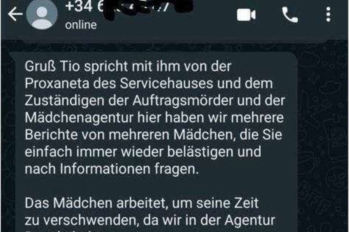 "Gruß Tio spricht mit ihm von der Proxaneta des Servicehauses und dem Zuständigen der Auftragsmörder und der Mädchenagentur hier haben wir mehrere Berichte von mehreren Mädchen, die Sie einfach immer wieder belästigen und nach Informationen fragen.