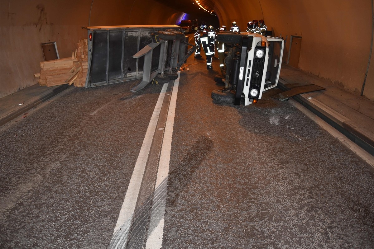 In Trin ist am Montagnachmittag im Umfahrungstunnel ein Fahrzeuggespann auf die Seite gekippt. An der Fahrzeugkombination entstand beträchtlicher Sachschaden.