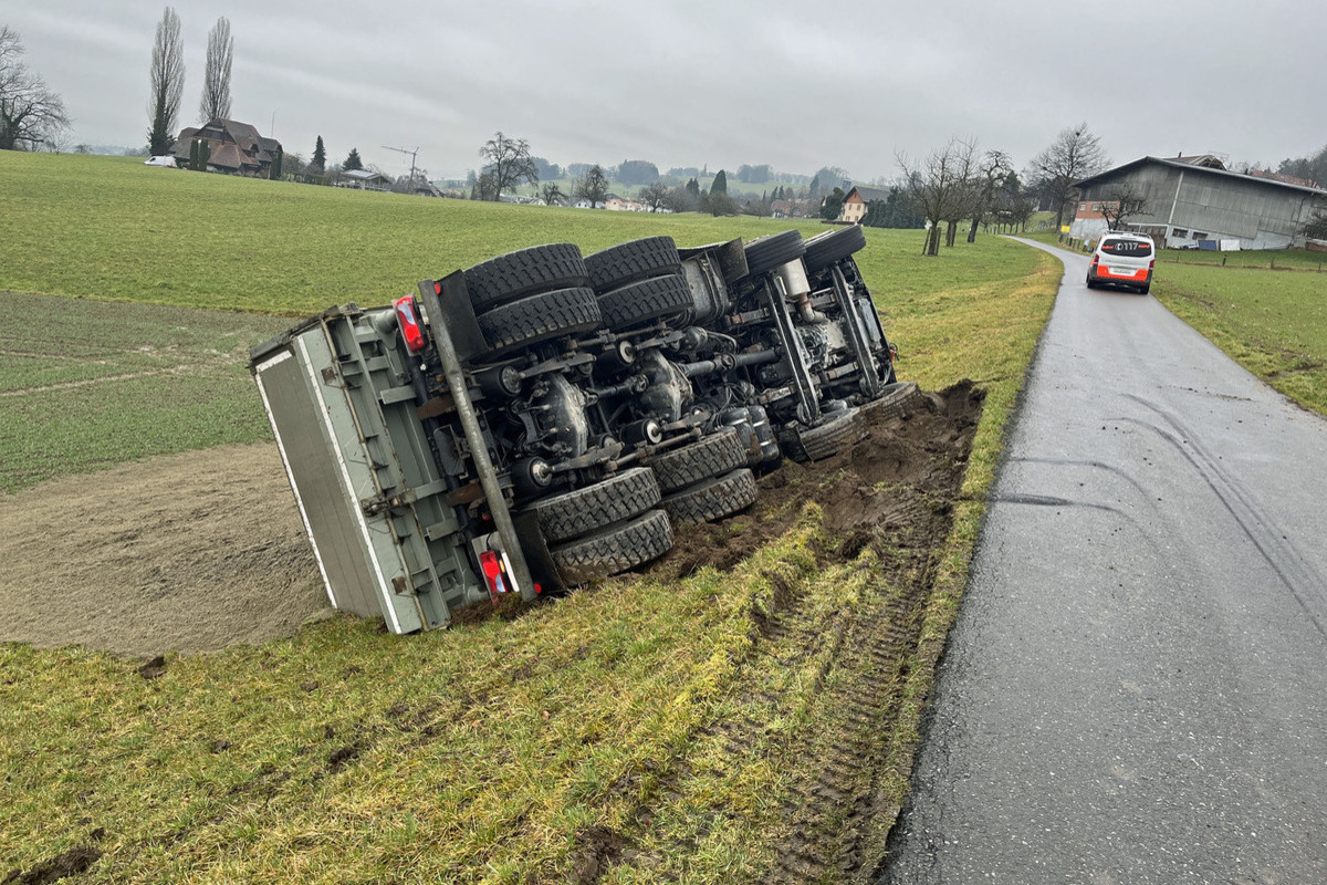 Ein Lastwagen fuhr am Donnerstag (19. Februar 2026, ca. 08:20 Uhr) auf der Widenmoosstrasse in Richtung Winikon. Aus noch ungeklärten Gründen geriet das Fahrzeug linksseitig ins Wiesland, rutschte ein Bord hinunter und kippte.