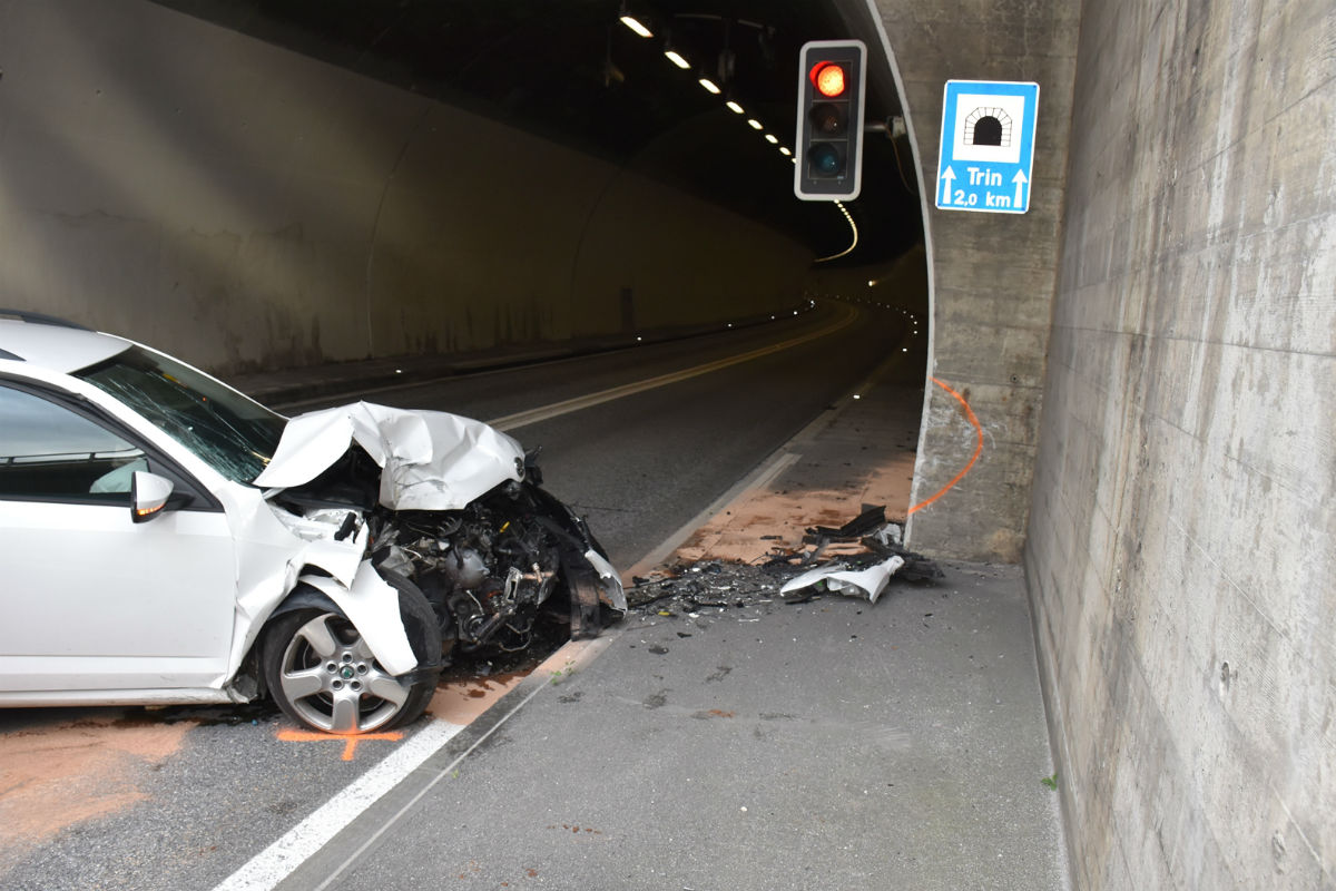 Die Kantonspolizei Graubünden erhielt um 16.52 Uhr die Meldung über ein verunfalltes Fahrzeug beim Tunnelportal West. Ein Personenwagen war auf der Fahrt in Richtung Tamins in die rechtsseitige Wand des Tunnelportals geprallt. Die Strassenrettung Flims rückte mit 14 Personen aus. Der 73-jährige Lenker gab an, wegen einer Verrichtung während der Fahrt von der Fahrspur abgekommen zu sein. Das total beschädigte Fahrzeug musste abgeschleppt werden.