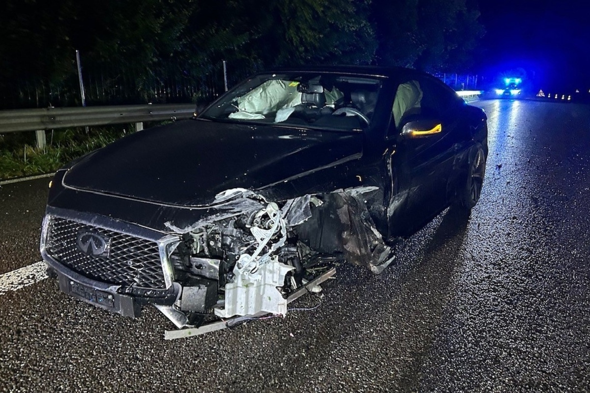 Die wuchtige Kollision riss das rechte Vorderrad weg und führte dazu, dass der Wagen die Autobahn abermals überquerte. Danach prallte dieser erneut gegen die mittlere Leitplanke, wodurch nun auch das linke Vorderrad losgerissen wurde. Der Infiniti kam schliesslich total demoliert auf der Fahrbahn zum Stillstand.