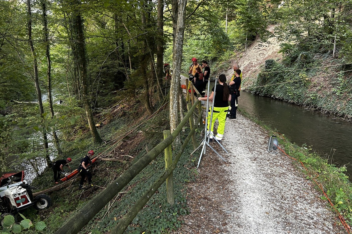 Zur Sicherung und Bergung des beschädigten Traktors im unwegsamen Gelände wurde neben dem Abschleppdienst auch die Feuerwehr aufgeboten. Die aufwändigen Arbeiten mussten auf Montag vertagt werden.