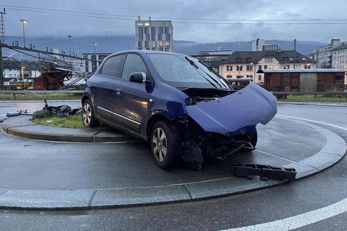 Das Auto kollidierte zunächst mit der Signalisation „Hindernis rechts umfahren“ sowie mit dem Richtungsanzeigepanel und kam schliesslich im Zentrum des Kreisels zum Stillstand.