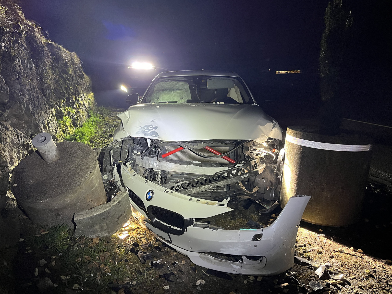 Ein junger Autofahrer krachte bei einem Verkehrsunfall in Dierikon gegen einen Betonblock. Das Auto wurde komplett zerstört.