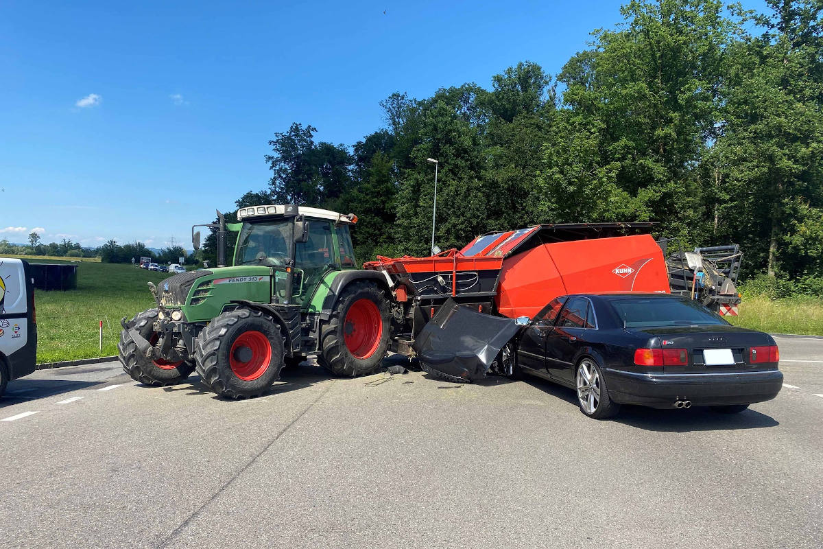 Der Unfall ereignete sich am Freitagnachmittag (2. Juli 2021), kurz nach 15:15 Uhr, beim «Zollhaus» in Hünenberg. Ein 48-jähriger Autofahrer fuhr auf der Sinserstrasse von Sins kommend Richtung Cham. Gleichzeitig beabsichtigte ein 21-jähriger Lenker eines Traktors samt Anhänger von der Drälikonerstrasse nach links in die Sinserstrasse einzubiegen. Dabei kam es auf der Kreuzung zu einem heftigen Zusammenstoss zwischen den beiden Fahrzeugen.