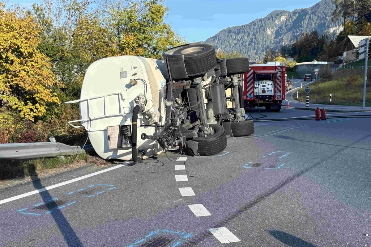 Unfall in Ilanz GR – Tankanhänger kippt im Kreisel