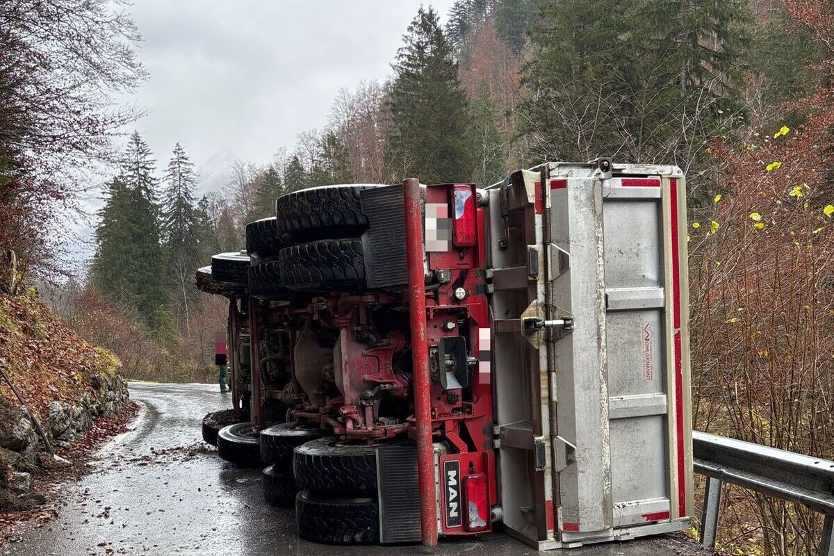 Zunächst brach das Heck des Fahrzeugs aus, ehe nach einem Gegenlenkmanöver dann die beiden Vorderachsen über eine Bruchsteinmauer auf eine Böschung am linken Strassenrand gerieten. In der Folge kippte der Lastwagen seitwärts und kam in seitlicher Lage auf der Fahrbahn zum Stehen.