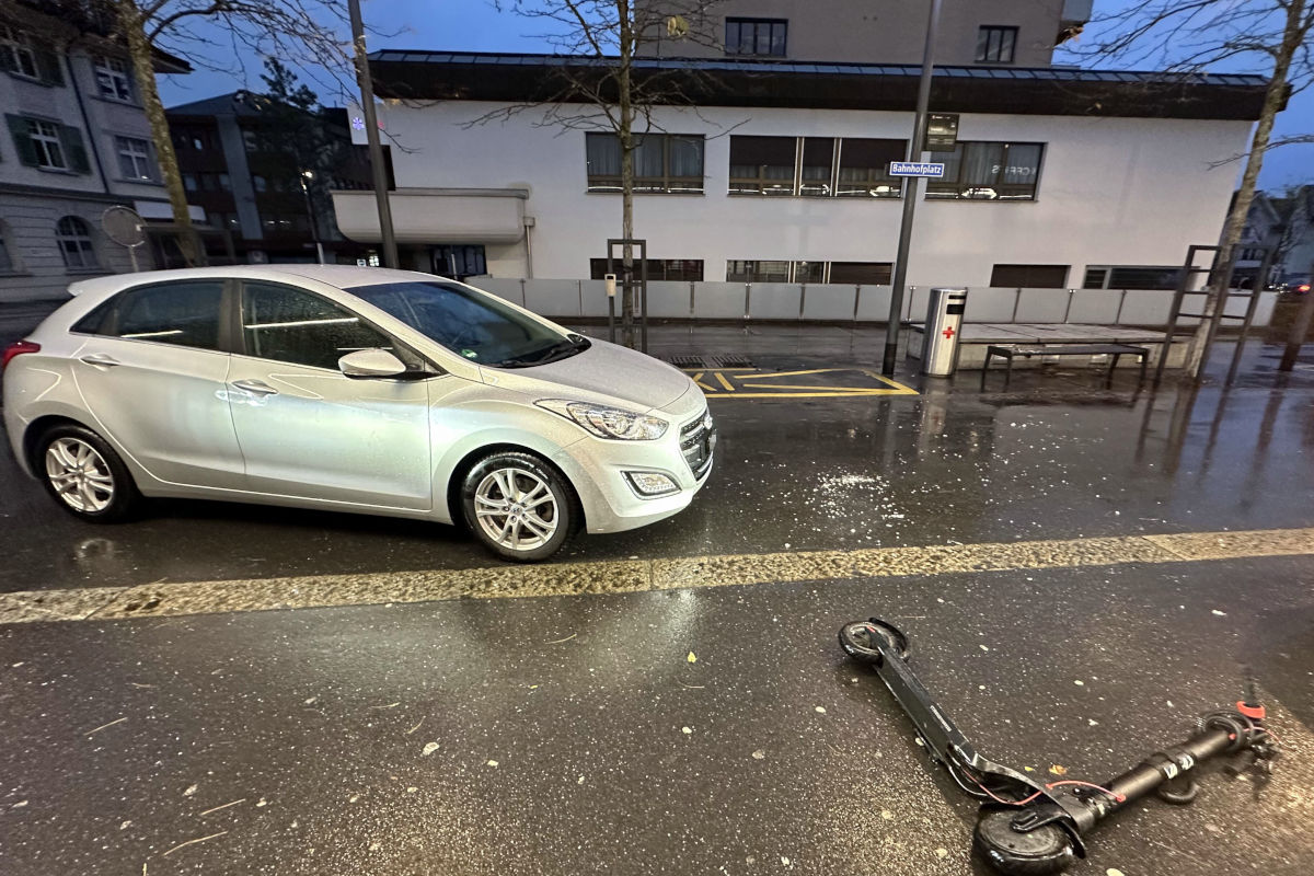 Am Montagmorgen, 27. Oktober 2025, kam es auf dem Bahnhofplatz in Lachen um 06.40 Uhr zu einem Verkehrsunfall zwischen einem Auto und einem E-Scooter.