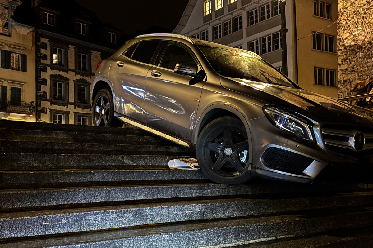 Heute Nacht, 14. April 2026, fuhr ein Automobilist in Luzern in der Altstadt über die Rathaustreppe und blieb stecken. Das Fahrzeug musste geborgen werden.