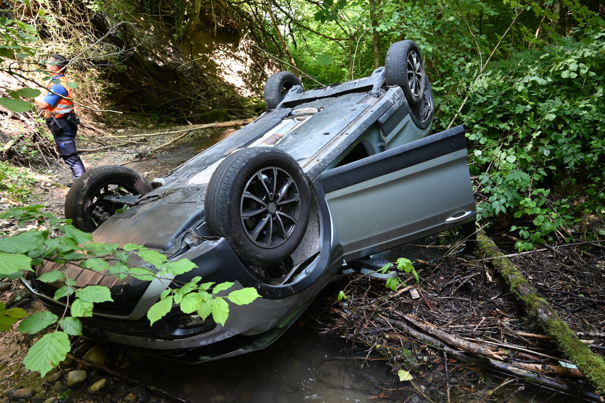 Aus bislang unbekannten Gründen kam das Auto des 74-Jährigen linksseitig von der Fahrbahn ab, überfuhr ein angrenzendes Wiesland und stürzte anschliessend rund 15 Meter einen Abhang hinunter und kam im Mühlrütibach auf dem Autodach zum Stillstand.