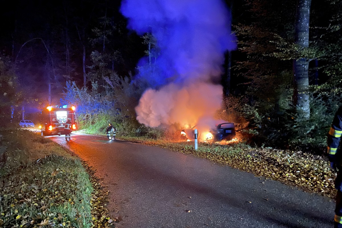 In einer leichten Rechtskurve kam ein Junglenker von der Strasse ab und prallte in einen Baumstrunk. Das Fahrzeug fing Feuer und brannte aus. Die drei Insassen konnten sich selbständig retten.