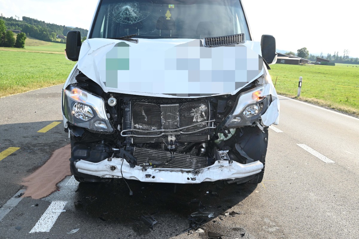 Der 26-jährige Lieferwagenfahrer bemerkte das Bremsmanöver zu spät, woraufhin es zum Auffahrunfall kam. Wegen Nichttragens des Sicherheitsgurtes wurde der 36-jährige Beifahrer gegen die Frontscheibe geschleudert. Er wurde leicht am Kopf verletzt. Auch der 42-Jährige und der 38-Jährige wurden leicht verletzt. Zwei Männer wurden vom Rettungsdienst ins Spital gebracht, einer konnte selbständig einen Arzt aufsuchen. Es entstand Sachschaden im Wert von rund 15'000 Franken.