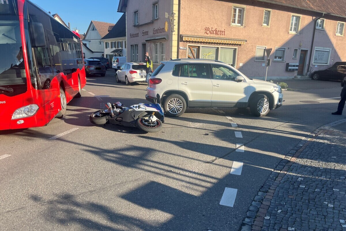 Um 07.45 Uhr am Mittwochmorgen (30.04.2025) bog eine 59-jähriger Mann mit einem Auto in Ramsen von der Hauptstrasse nach links in die Sonnenstrasse ab. Dabei übersah er einen 23-jährigen Mann, der mit einem Motorrad auf der Hauptstrasse in entgegengesetzte Richtung fuhr. In der Folge kollidierten auf der Verzweigung das Motorrad und das Auto gegeneinander. Der Mann und das Motorrad wurden aufgrund der Kollision zu Boden geschleudert.