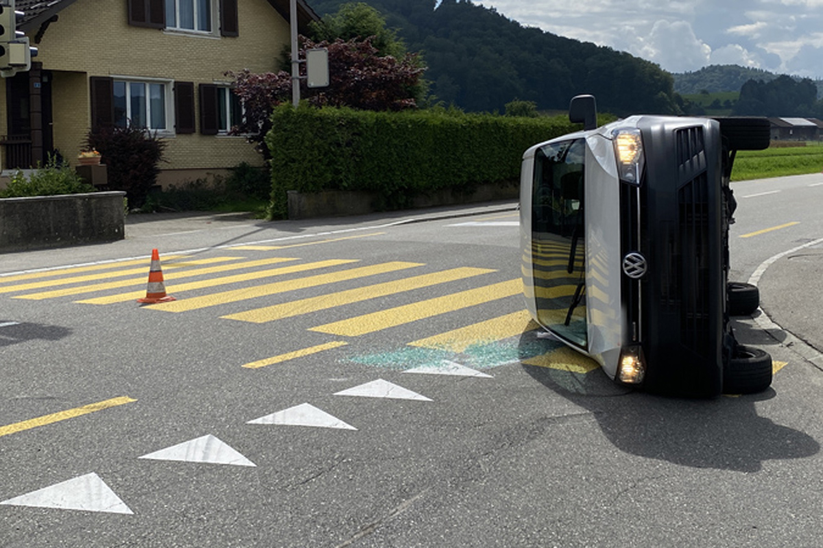 Bei der Kreuzung Dorfstrasse-Luzernerstrasse kam es zu einer Kollision zwischen einem Auto und einem Lieferwagen. Der Lieferwagen kippte dabei auf die Seite.