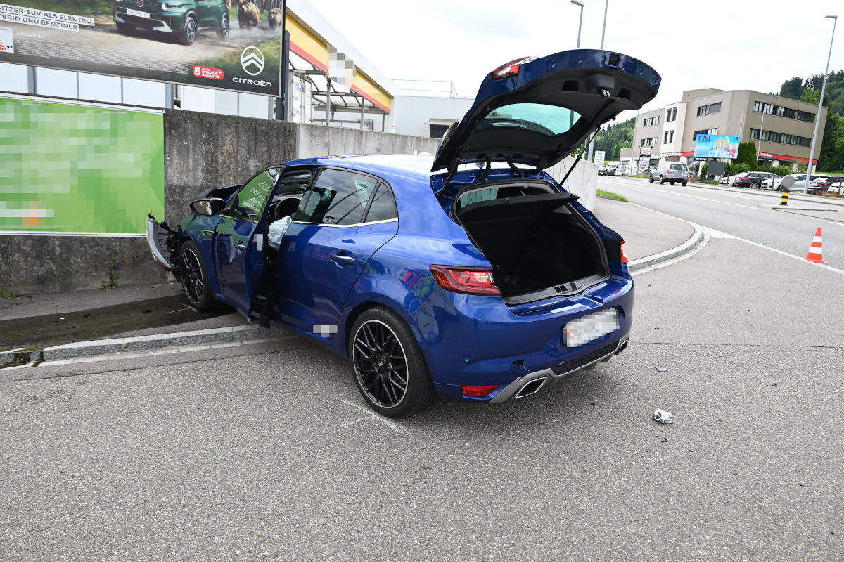Aus noch ungeklärten Gründen kam das Auto linksseitig von der Fahrbahn ab und prallte auf Höhe der Erlenstrasse frontal gegen die Betonmauer einer Waschanlage.