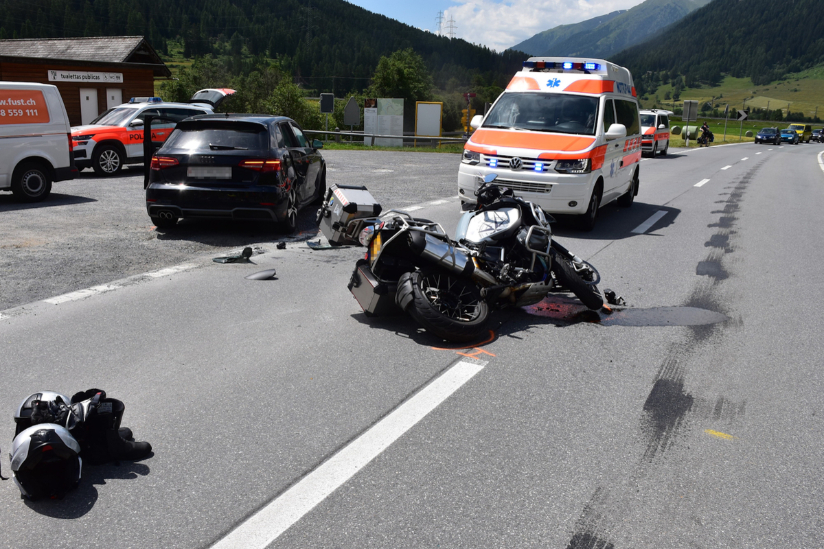 Seine Sozia wurde über das Auto geschleudert und mittelschwer verletzt. Auch der Fahrer erlitt durch die Kollision leichte Verletzungen. Drittpersonen leisteten bis zum Eintreffen der Ambulanz des Stützpunktes Zernez Erste Hilfe. Das Ambulanzteam bereitete anschliessend beide Verletzten für den Weitertransport vor.