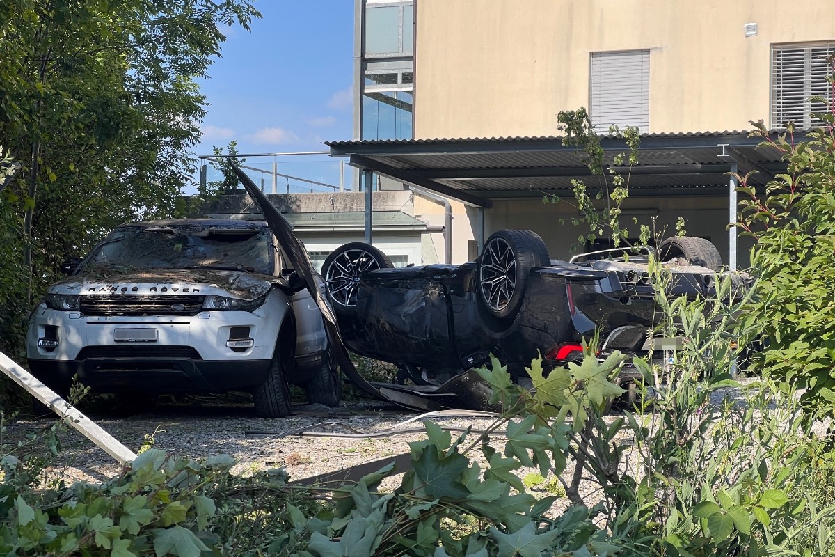 Dadurch hob es ab, prallte auf ein parkiertes Auto, wurde abgewiesen und kam auf dem Dach liegend zum Stillstand. Der 20-jährige Autofahrer wurde durch den Unfall unbestimmt verletzt. Er musste von der örtlichen Feuerwehr geborgen und anschliessend vom Rettungsdienst ins Spital gebracht werden. Die drei Mitfahrer im Alter von 17 und 18 Jahren erlitten leichte Verletzungen. Diese konnten das Auto selbständig verlassen. Der entstandene Sachschaden kann noch nicht genau beziffert werden, wird aber auf über 100'000 Franken geschätzt.