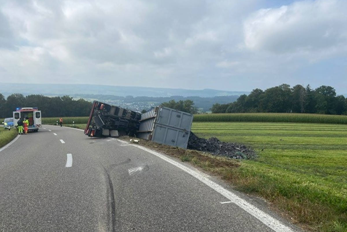 Der Selbstunfall ereignete sich am Donnerstag, 23. September 2021, um 11.40 Uhr auf der Hauptstrasse zwischen Oberwil-Lieli und Unterlunkhofen. In einem fünfachsigen Lastwagen mit Mulde war der Fahrer talwärts in Richtung Unterlunkhofen unterwegs. In einer Linkskurve verlor er die Herrschaft über das Fahrzeug, worauf dieses nach rechts kippte. Der Lastwagen kam schliesslich auf der Seite liegend in der angrenzenden Wiese zum Stillstand. Die aus Eisenschrott bestehende Ladung wurde im Land verstreut.