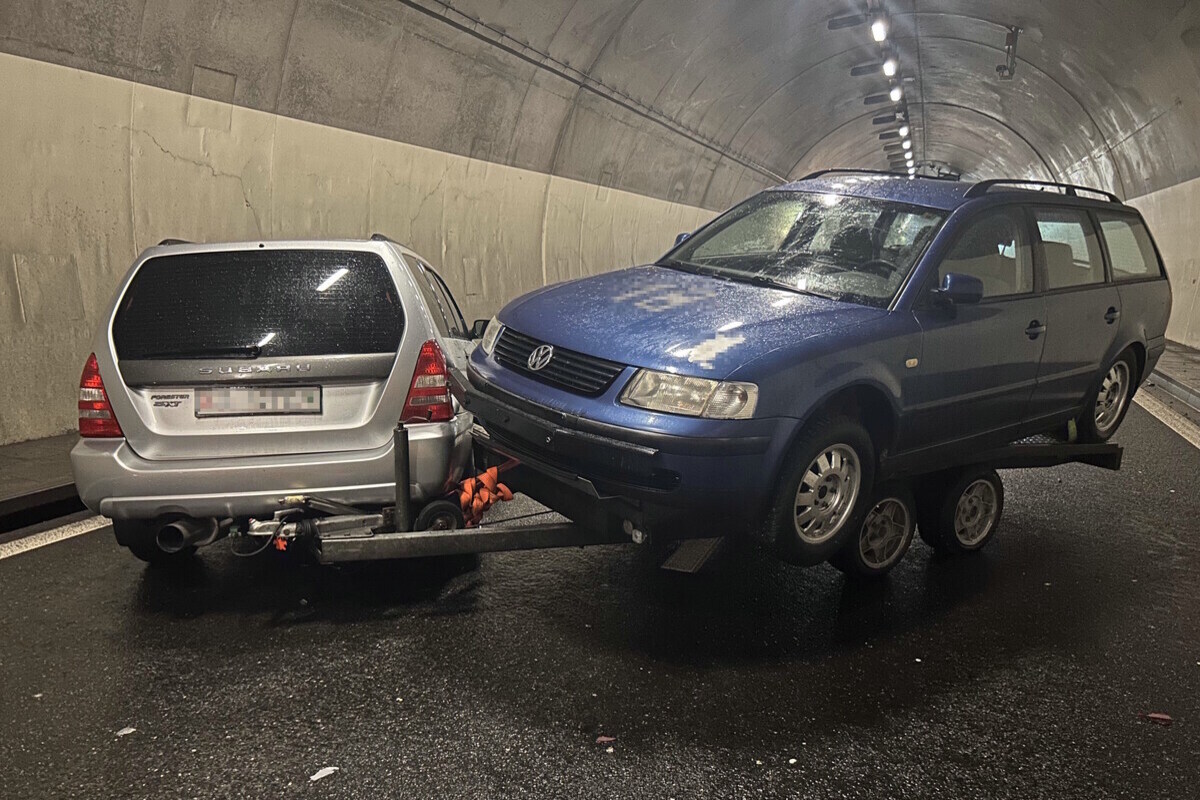 Anschliessend prallte das Auto gegen den rechten Randstein, drehte sich in die entgegengesetzte Fahrtrichtung und die Fahrzeugkombination kam quer im Tunnel über beide Fahrstreifen zum Stillstand.