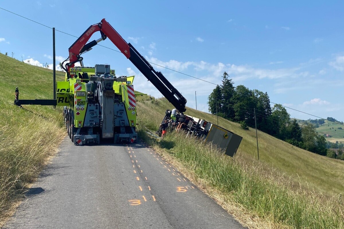 Für die Bergung des Lastwagens musste die Strasse für mehrere Stunden gesperrt werden. Ein privates Abschleppunternehmen konnte das Fahrzeug mit einem Kran anheben und aufladen.