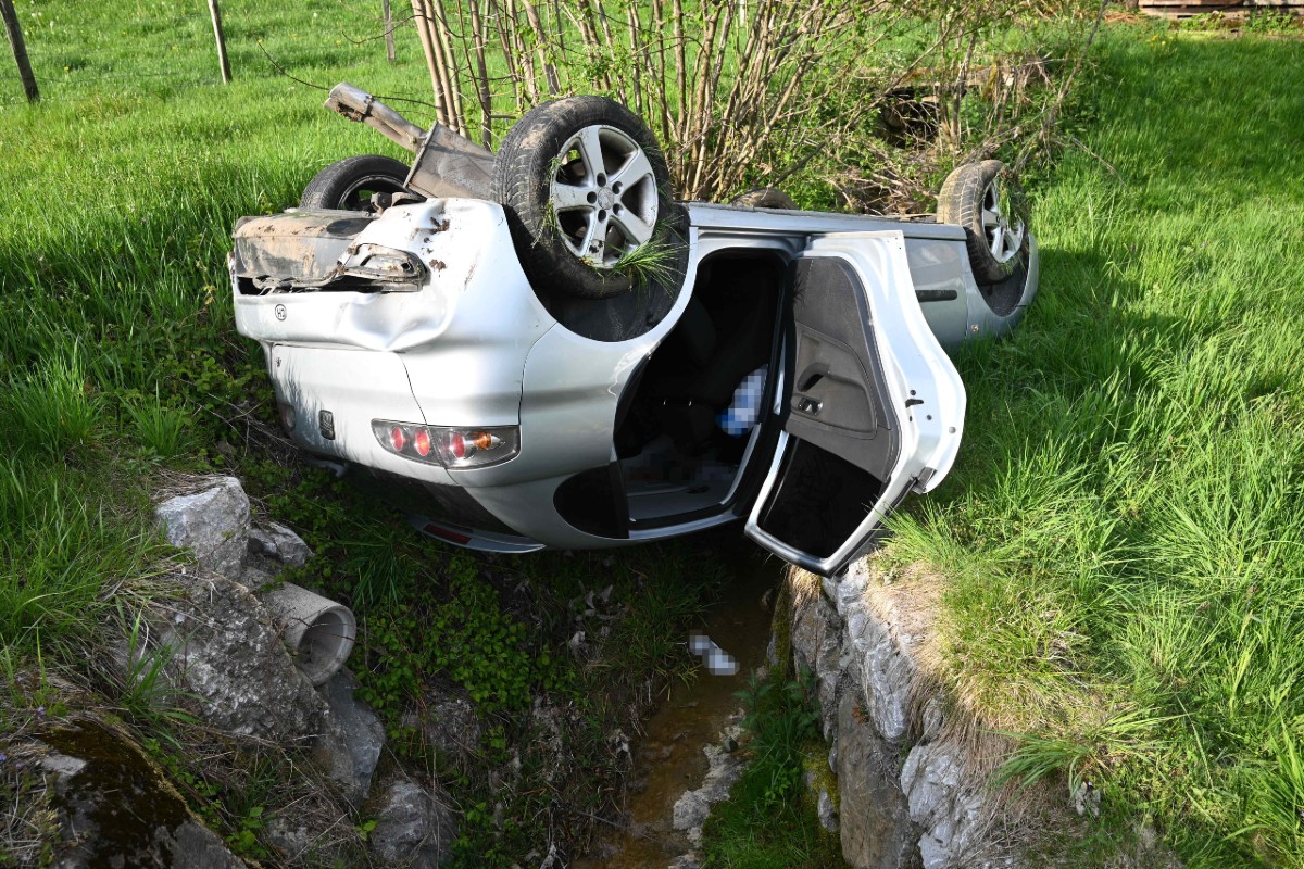 Am Ende des Vorplatzes hob das Auto aufgrund einer Mauer ab und kam im Bachbett, auf dem Dach liegend, zum Stillstand. Der 18-jährige Autofahrer und die 13-jährige Beifahrerin wurden bei dem Unfall nicht verletzt. Es entstand Sachschaden in der Höhe von rund 5'500 Franken.
