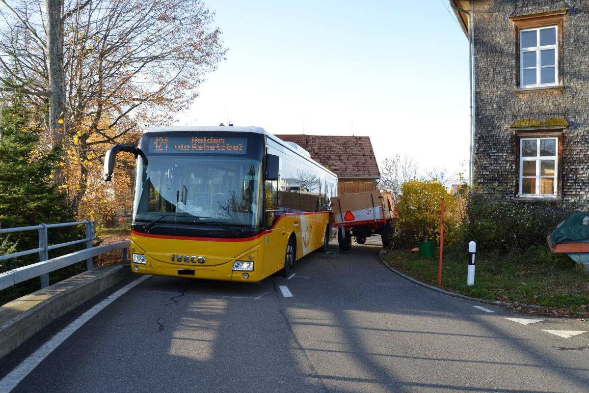 Um 15.10 Uhr lenkte ein 33-jähriger Mann einen landwirtschaftlichen Motorkarren von Rehetobel in Richtung Speicherschwendi. In der scharfen Rechtskurve Höhe der Örtlichkeit "Midegg" kam es beim Kreuzen mit einem Postauto zu einer seitlichen Streifkollision.
