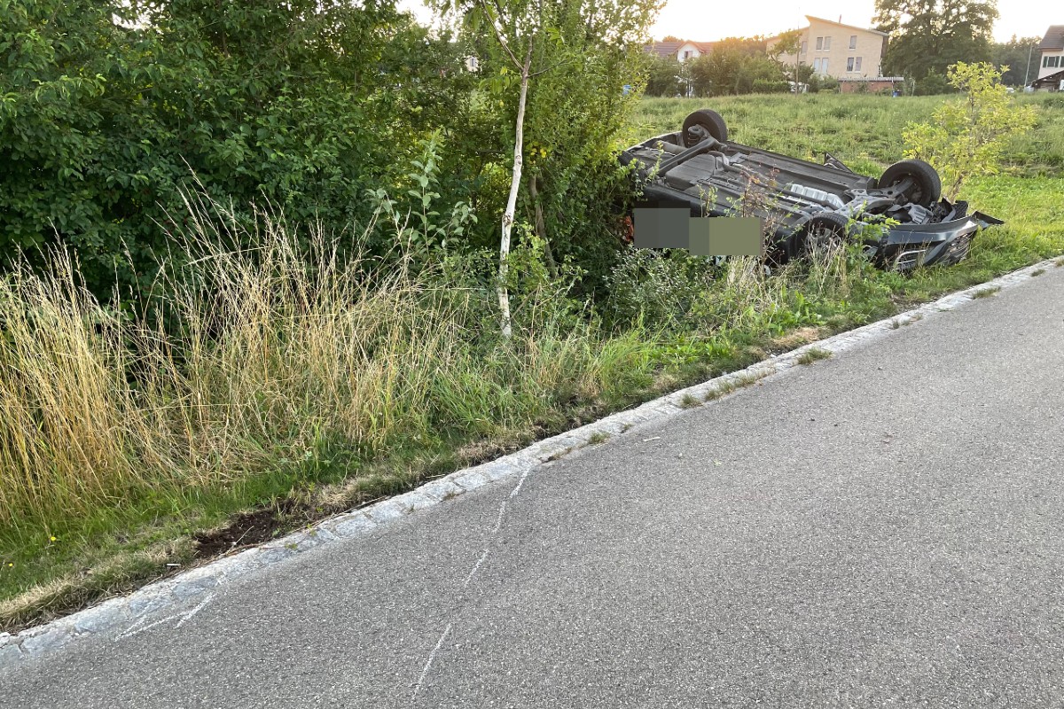 In der Folge überschlug sich das Auto und kam im angrenzenden Wiesland auf dem Dach liegend zum Stillstand.