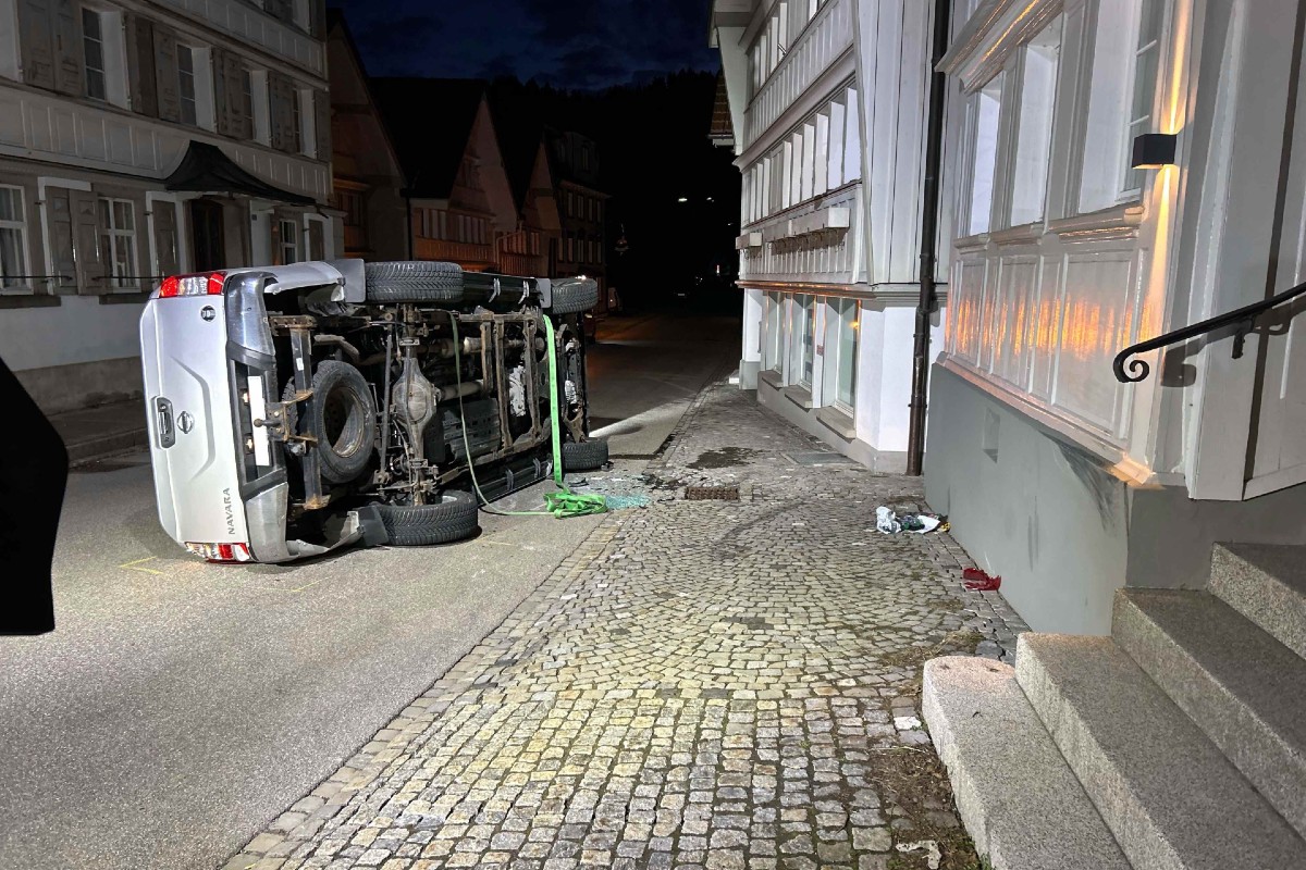 Verkehrsunfall in Schwellbrunn AR - Mit Auto über Treppe gefahren und auf Seite gekippt