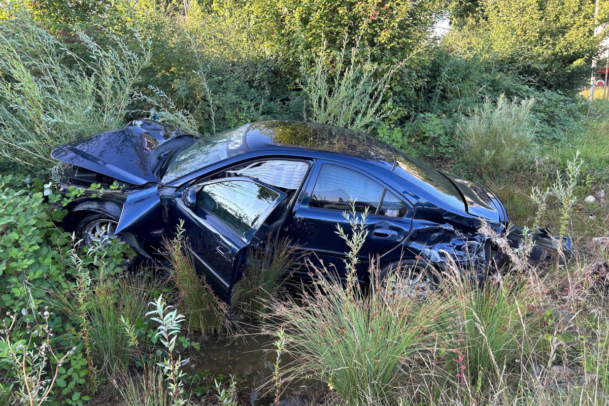 Nach der kollisionsreichen Fahrt blieb das Fahrzeug schlussendlich in einer Böschung stehen. (Bildquelle: Kantonspolizei Aargau)