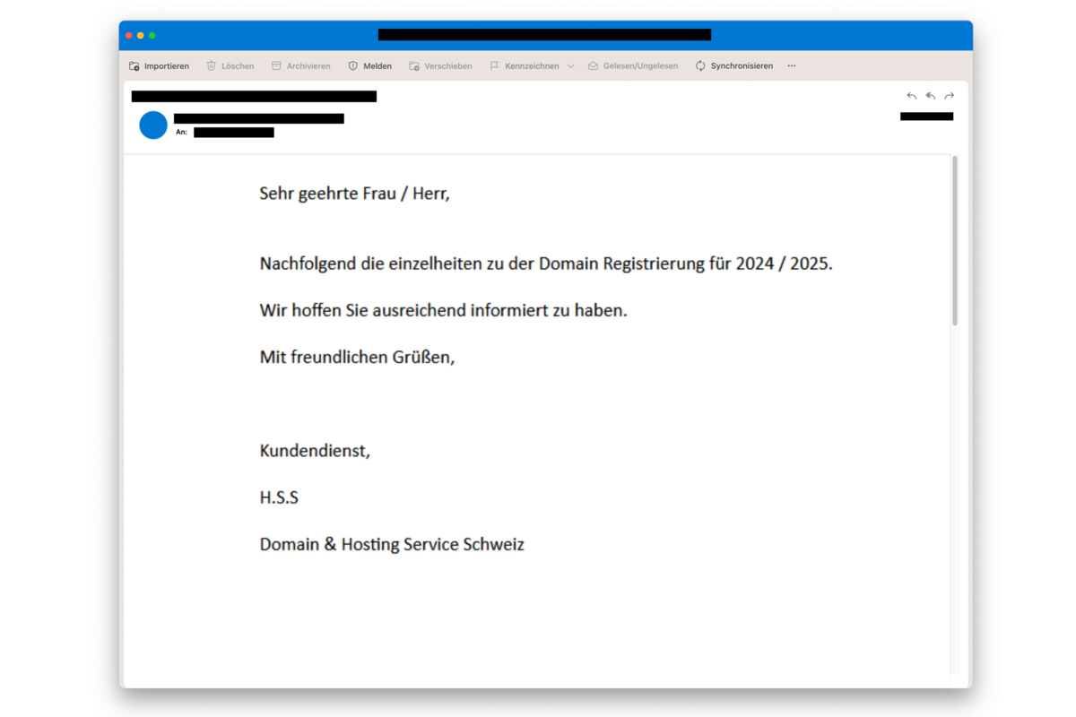 In letzter Zeit werden viele Personen von einem angeblichen Domain- und Hosting-Anbieter kontaktiert. Die Täterschaft, die sich hinter der «H.S.S. Domain & Hosting Service Schweiz» versteckt, verschickt Rechnungen für Domain-Registrierungen und DNS-Servicekosten. Die Firma und die vermeintliche Domain-Registrierung sind frei erfunden.