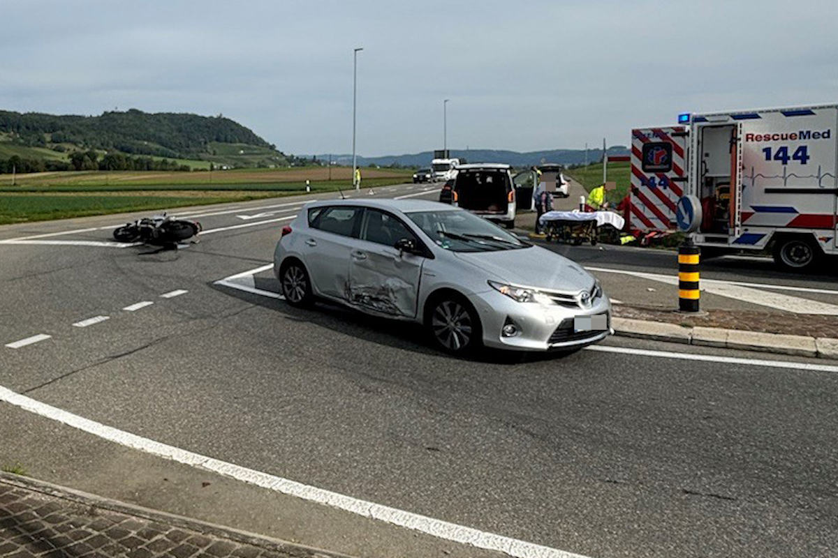 Ein 76-jähriger Autofahrer war kurz nach 15 Uhr auf der Hauptstrasse Richtung Rheinklingen unterwegs. Bei der Abzweigung Richtung Ramsen bog der Deutsche links auf die Auffahrt ab. Gleichzeitig fuhr ein Motorradfahrer auf der vortrittsberechtigten Hauptstrasse entgegen und kollidierte mit dem Auto. Der 41-jährige Schweizer wurde mittelschwer verletzt und musste durch den Rettungsdienst ins Spital gebracht werden. Der Autofahrer blieb unverletzt. Es entstand Sachschaden von mehreren tausend Franken.