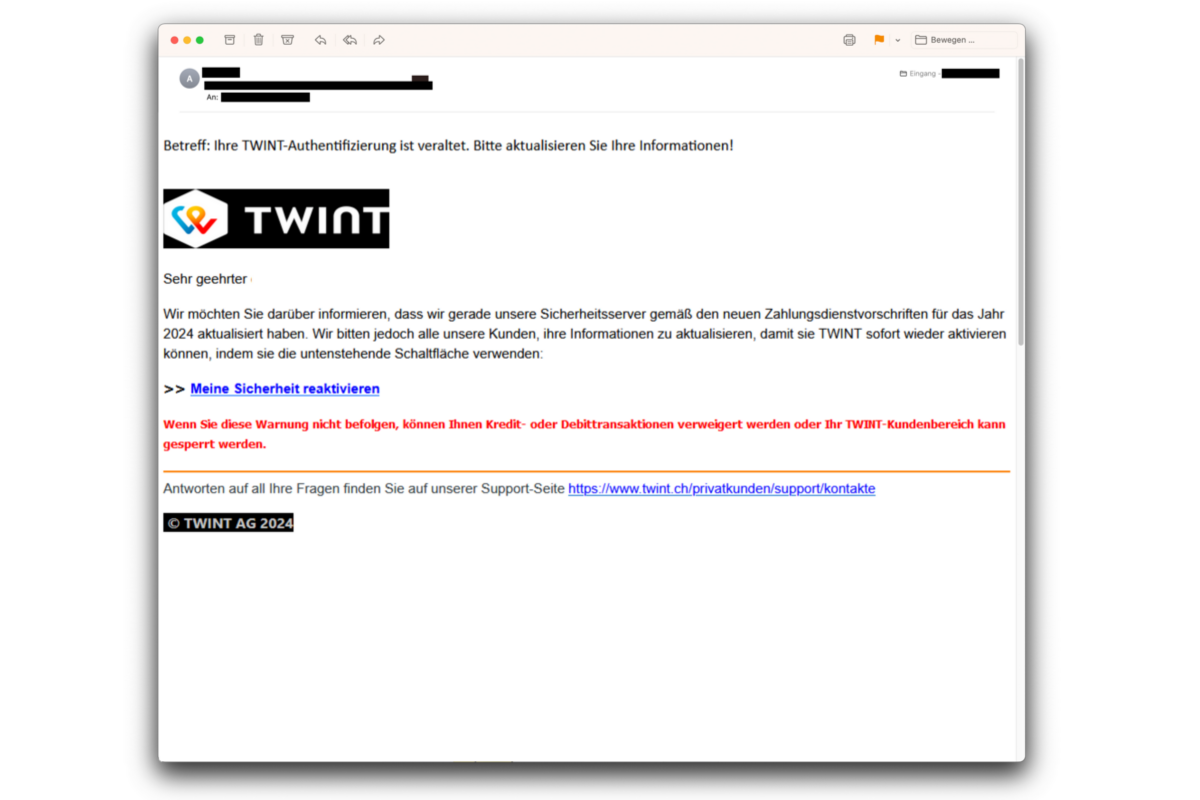 Damit der Zugang zum TWINT-Konto nicht verloren wird, sollen die Kontoinformationen aktualisiert werden. Cyberkriminelle verschicken dafür E-Mails, welche angeblich von TWINT stammen, um potenzielle Opfer in die Phishing-Falle zu locken.