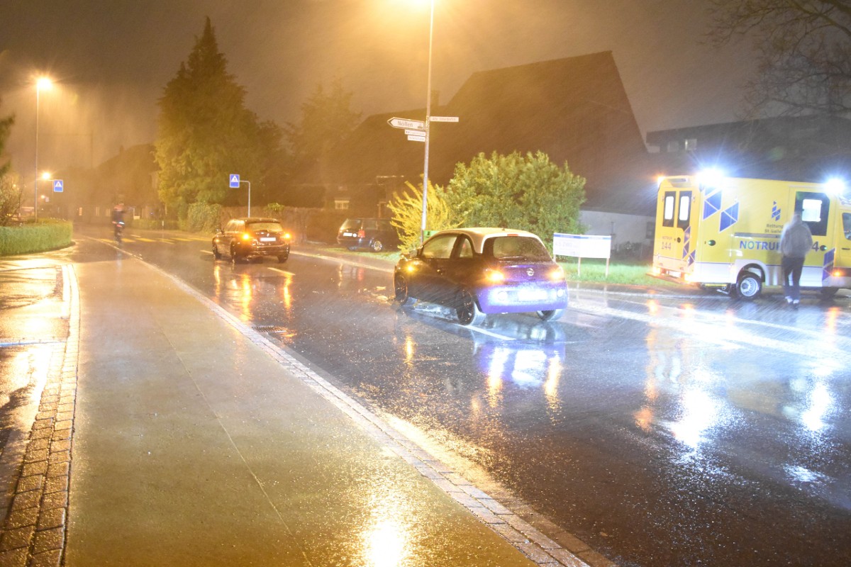 Die 22-jährige fuhr auf der Unterdorfstrasse Richtung Dorfzentrum. Zur gleichen Zeit fuhr eine 26-jährige mit ihrem Auto in die gleiche Richtung voraus und wollte in die Nöllenstrasse einbiegen. Die 22-jährige bemerkte dies zu spät und die beiden Autos stiessen zusammen. Die Unfallverursacherin und ihre Beifahrerin wurden dabei leicht verletzt. Die ausgerückten Rettungswagen brachten beide ins Spital. An den Autos entstand Sachschaden in der Höhe von ca. 10'000 Franken.