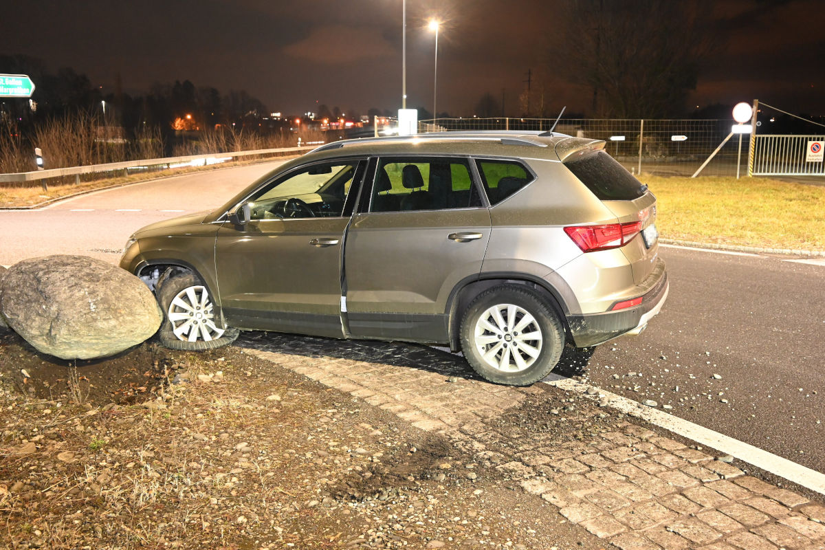 Die Fahrt der Frau endete an einem Stein bei einem Kreisel. (Bildquelle: Kantonspolizei St.Gallen)