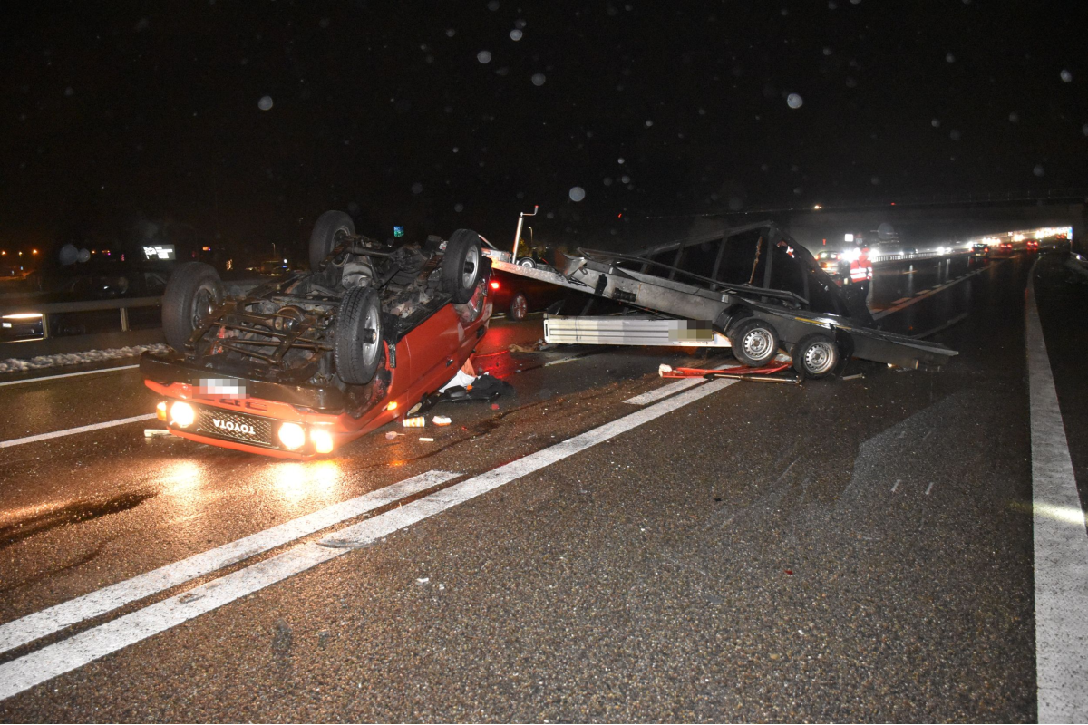 Seine Versuche, das Auto und den Anhänger wieder zu stabilisieren, zeigten nicht den gewünschten Erfolg, worauf sich die Fahrzeugkombination überschlug. Das Zugfahrzeug kam auf dem Dach, der Anhänger auf der Seite liegend zum Stillstand. Verletzt wurde niemand.