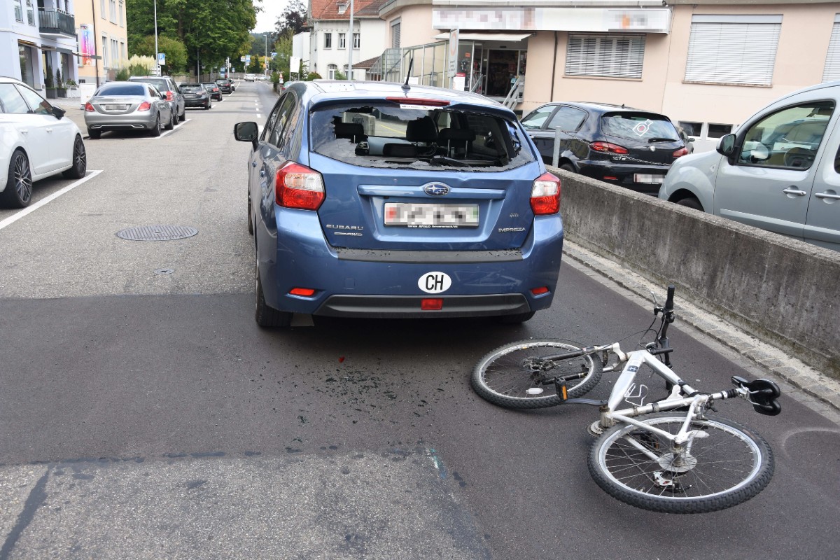 Ein 70-jähriger Mann fuhr mit seinem Auto auf der Unteren Bahnhofsstrasse Richtung Rudenzburg. Gleichzeitig fuhr ein 19-jähriger Mann mit seinem Velo hinter dem 70-Jährigen in dieselbe Richtung.