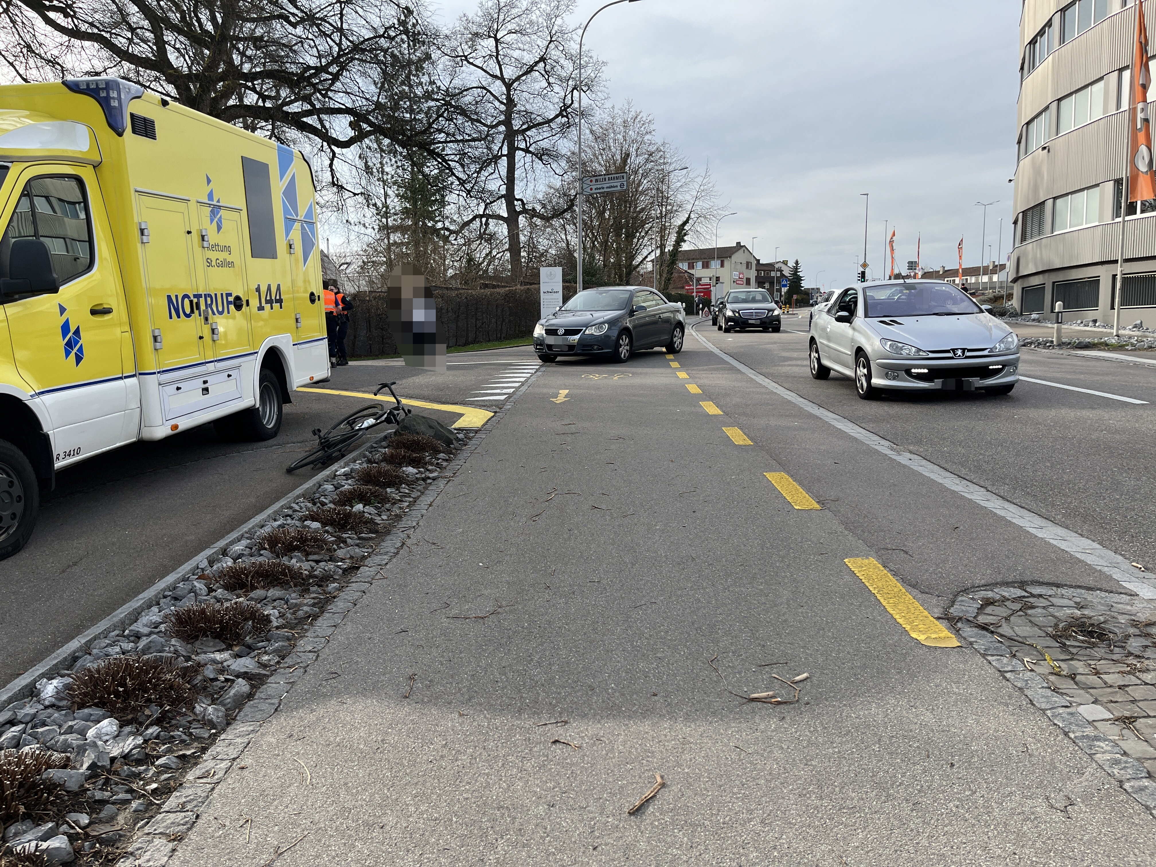 Eine 24-jährige Frau fuhr mit ihrem Auto aus dem Lipo-Kreisel in Richtung Schwarzenbach. Nach dem Kreisel bog sie rechts auf den dortigen Parkplatz ab. Zur gleichen Zeit fuhr die 38-jährige Rennvelofahrerin auf dem Rad-Fussweg in dieselbe Richtung. In der Folge kam es zur Kollision zwischen dem Auto und dem Rennvelo. Dadurch kam die 38-Jährige zu Fall und verletzte sich leicht. Der Rettungsdienst brachte sie ins Spital. Der entstandene Sachschaden wird auf rund 2'000 Franken geschätzt.