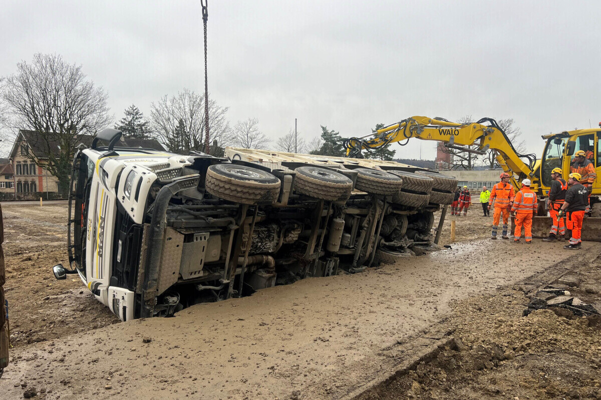Am Freitagmittag, 9. Februar 2024, kippte auf einer Baustelle in Winterthur ein Lastwagen um. Verletzt wurde niemand. Die Bergungsarbeiten dauern an.