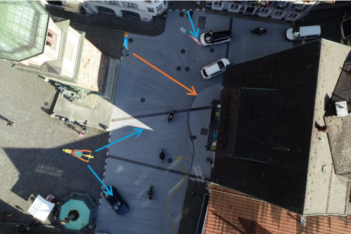 Fahrzeuge (auch Velos), welche vom Rathausplatz oder der Schützengasse in die Tellsgasse einmünden (blaue Pfeile), müssen den Fahrzeugen auf der Tellsgasse bzw. Schmiedgasse aufgrund der gestrichelten Markierungslinie den Vortritt gewähren.