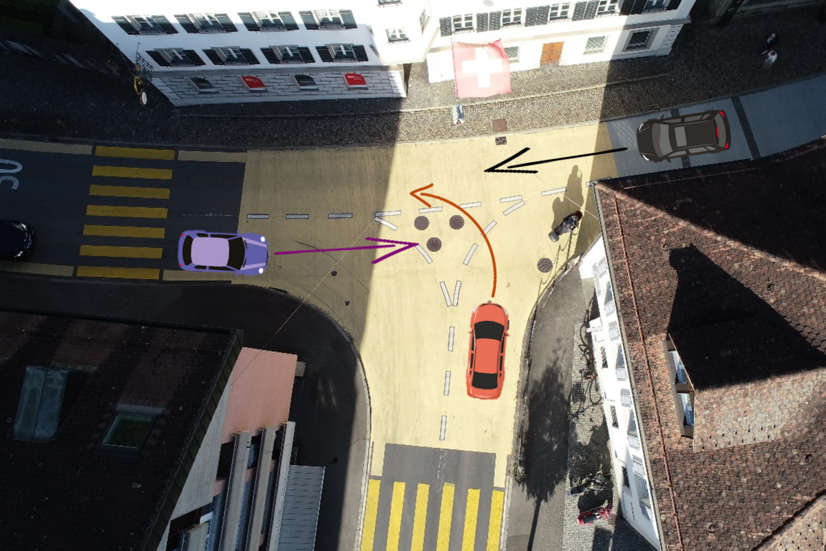 Kreuzung beim Polizeiposten Altdorf (Ankenwaage): Das rote Fahrzeug hat Rechtsvortritt vor dem lila Fahrzeug, jedoch nicht vor dem schwarzen Fahrzeug. Zusätzlich haben in Tempo-30-Zonen Fahrzeuge Vortritt gegenüber Personen, die zu Fuss oder mit einem fahrzeugähnlichen Gerät wie Trottinett oder Skateboard unterwegs sind.