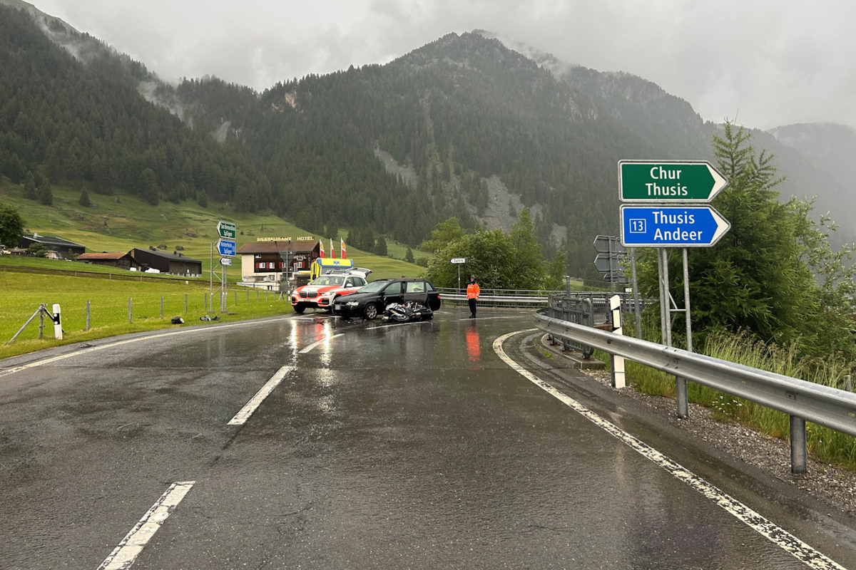 Kurz vor 17.30 Uhr kam es in Sufers zu einem weiteren Verkehrsunfall mit einem Motorrad. Ein 50-Jähriger fuhr mit seinem Sohn als Sozius von Hinterrhein kommend über die Italienische Strasse in Richtung Thusis. Bei Sufers wollte er in einer Rechtskurve geradeaus in Richtung einer Tankstelle fahren. Dabei übersah er einen um die Kurve kommenden 51-jährigen Automobilisten aus der Gegenrichtung und kollidierte mit diesem.
