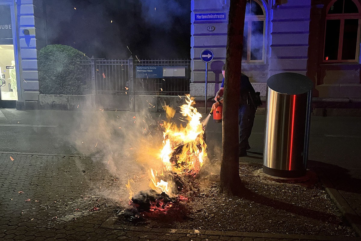 In der Nacht auf Dienstag, 13. Juni 2023, um ca. 02:45 Uhr wurde der Luzerner Polizei ein brennender Kartonstapel sowie ein rauchender Abfalleimer an der Hertensteinstrasse in der Stadt Luzern gemeldet. Die Einsatzpatrouille der Polizei konnte den Brand rasch löschen.