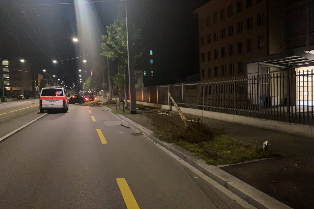 Mercedes auf das Trottoir der rechten Strassenseite und kollidierte dort unter anderem mit zwei Bäumen, bevor er starkbeschädigt wieder auf der Fahrbahn zum Stehen kam.