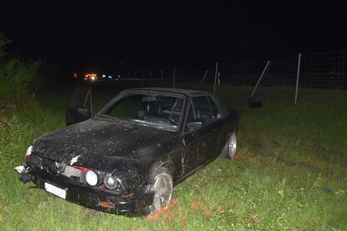 Kurz vor dem Rastplatz Apfelwuhr verlor er auf der nassen Fahrbahn die Herrschaft über sein Auto und kam rechts von dieser ab. Dabei durchschlug das Auto den Wildschutzzaun, fuhr eine Böschung hinunter und über das Wiesland weiter.