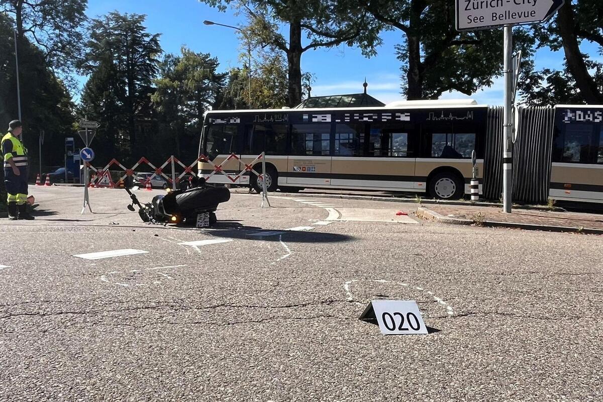 Kurz nach 10.45 Uhr fuhr ein Personenwagen von Zürich herkommend auf der Zollikerstrasse in den Kreisel beim Dufourplatz ein. Im Kreisel kollidierte der Personenwagen aus unbekannten Gründen zuerst mit einem Motorrad und danach mit einem leeren, stehenden Linienbus.