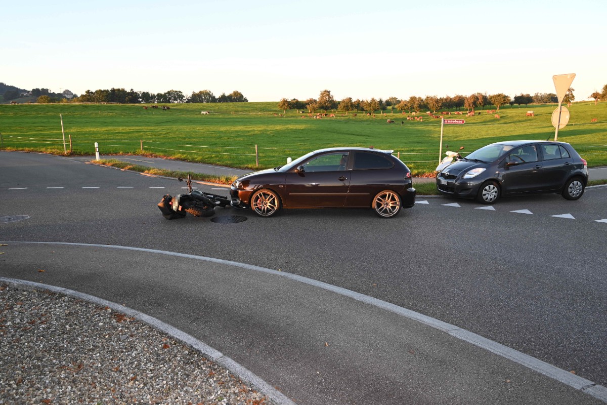 Am Donnerstag (23.09.2021), um 18:45 Uhr, ist auf der Dorfstrasse ein Auto mit einem Motorrad zusammengestossen. Ein 17-jähriger Motorradfahrer wurde dabei verletzt. Der Rettungsdienst brachte ihn ins Spital. Es entstand Sachschaden von mehreren tausend Franken.