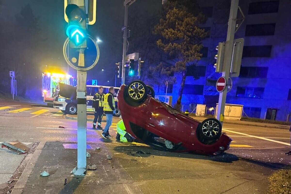 Bei der langgezogenen Linkskurve kam er aus unbekannten Gründen von der Fahrbahn ab. Das Fahrzeug überschlug sich und kam beim Lichtsignalmast an der Verzweigung Winterthurer-/Bülachstrasse auf dem Dach zu stehen. Der Lenker sowie die beiden Beifahrerinnen, eine 21-jährige und eine 22-jährige Italienerin verletzten sich beim Unfall erheblich.