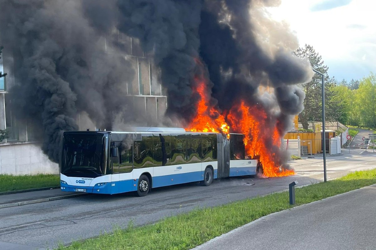 gestern ein Gelenkbus der Linie 80 von der Lerchenhalde herkommend Richtung ETH Hönggerberg. Kurz vor der Haltestelle bemerkte der Buschauffeur im Heckbereich eine kleine, weisse Rauchwolke und ungewöhnlichen Geruch. Geistesgegenwärtig hielt er sofort an und bat die 50-60 Passagiere, den Bus umgehend zu verlassen. Nur kurze Zeit später entzündete sich im Heckbereich ein Feuer, das sich rasant ausbreitete, sodass das Fahrzeug innert Minuten in Vollbrand stand. Die kurze Zeit später eintreffenden Einsatzkräfte der
